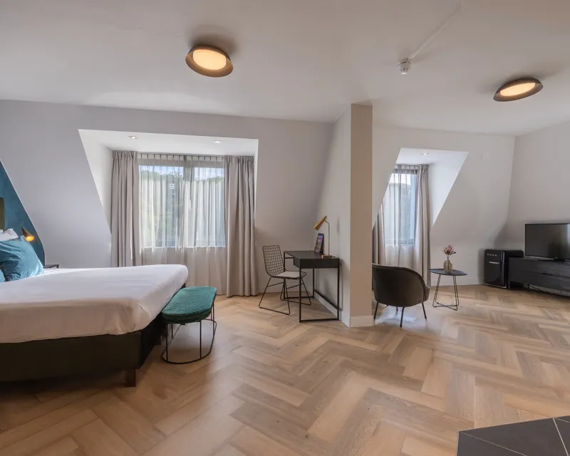 Suchen Sie ein geräumiges Zimmer mit einer eigenen intimen und gemütlichen Atmosphäre? Dann ist die Junior Suite genau das Richtige für Sie. Die Suite befindet sich im zweiten Stock, hat eine Fläche von 52 m2 und bietet einen schönen Blick auf die Wälder von Wassenaar. Die Suite ist komfortabel eingerichtet, ausgestattet mit einer Sitzecke mit Kaffeemaschine, einem großzügigen Doppelbett und einem offenen Badezimmer mit Regendusche und separater Badewanne. Selbstverständlich verfügt das Zimmer über ein separates WC und diverse Pflegeprodukte sind vorhanden.