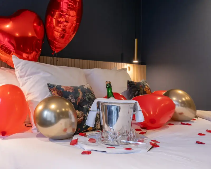 Do you want to surprise your loved one? Book this Love package for an extra romantic stay! The package includes a card with a personal message, rose petals, a heart-shaped helium balloon, heart-shaped balloons scattered around the room, a box of macarons, and a bottle of bubbly. Cost: € 36.50