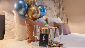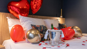 Do you want to surprise your loved one? Book this Love package for an extra romantic stay! The package contains a card with a personal message, rose petals, a heart balloon with helium, 8 heart balloons spread around the room, a box of macarons and a bottle of bubbles. Costs: €35.00