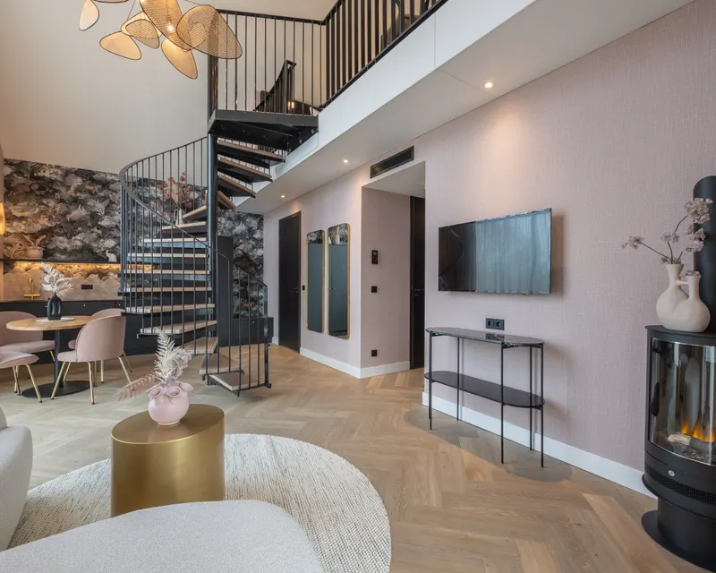 Ons Penthouse is een prachtige, unieke suite om in te verblijven. De ruime suite heeft een aparte vliering voor de slaapkamer, welke met een wenteltrap te bereiken is. In de benedenruimte is een heerlijke zithoek met een elektrische haard. De enorme raampartij zorgt voor meer dan voldoende daglicht. Er zijn elektrisch bedienbare gordijnen om deze af te sluiten. De kitchenette met Quooker kraan, magnetron, koelkast en koffie- en theefaciliteiten maakt deze suite uitstekend geschikt voor lange verblijven. Er is een inloopdouche met regendouche, een vrijstaand bad en er zijn twee aparte toiletten aanwezig (één boven bij de slaapkamer en één beneden). Het balkon maakt deze Penthouse helemaal compleet.